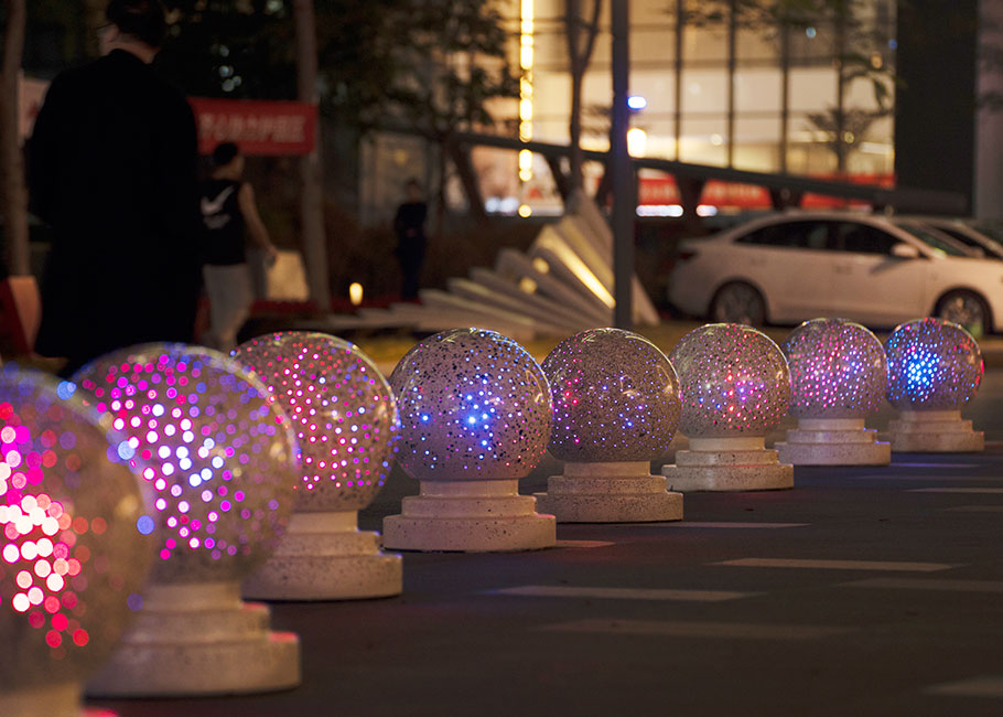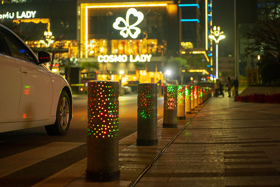 新型路障石材具有擋車功能,提升場所的形象和安全性,夜晚展現(xiàn)出特別絢麗的效果